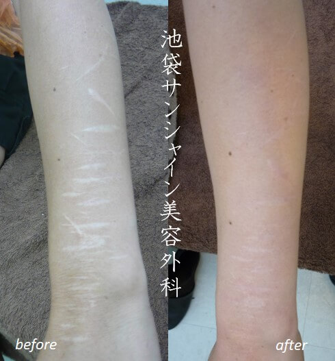 | 所見 | 男性のリストカット傷跡治療の症例です。 岩手県からお通いいただいていました。 当院では遠方からお越しの方も多数いらっしゃいます。 |
