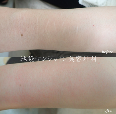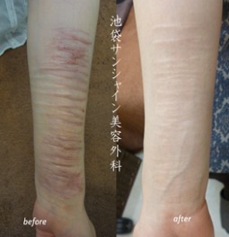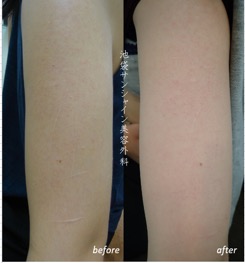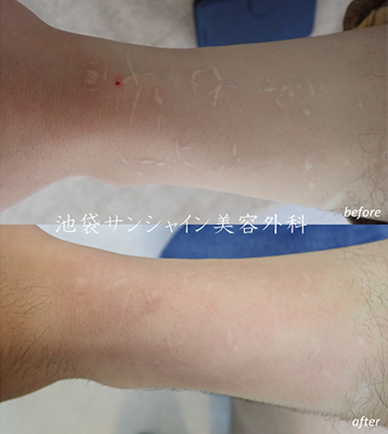 | 所見 | 男性のリストカット傷跡治療の症例です。 左の上腕に何か所も太い傷や細い傷があります。 細い傷はほとんどわからなくなりました。さらにもう1クールするとより改善してくるでしょう。 |