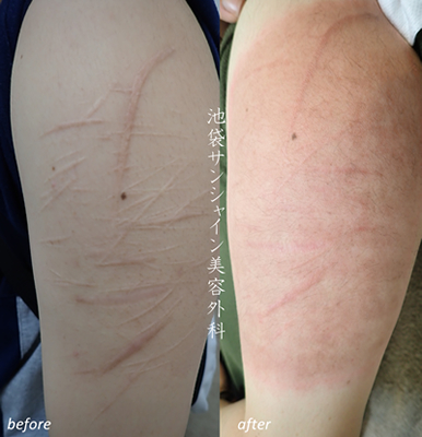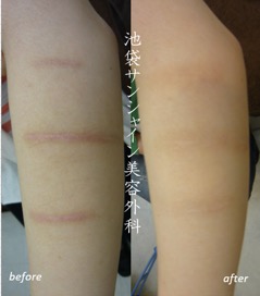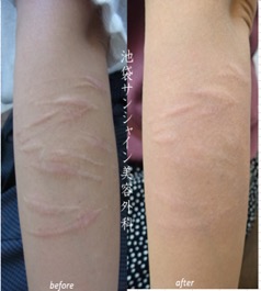 | 所見 | 離れたところに3本のお傷のある患者様の症例です。 5回照射を行うことで、かなり改善しました。照射後の色素沈着がAFTER写真にございます。 この色素沈着は時間とともに改善してまいります。 |